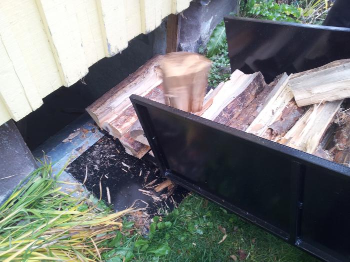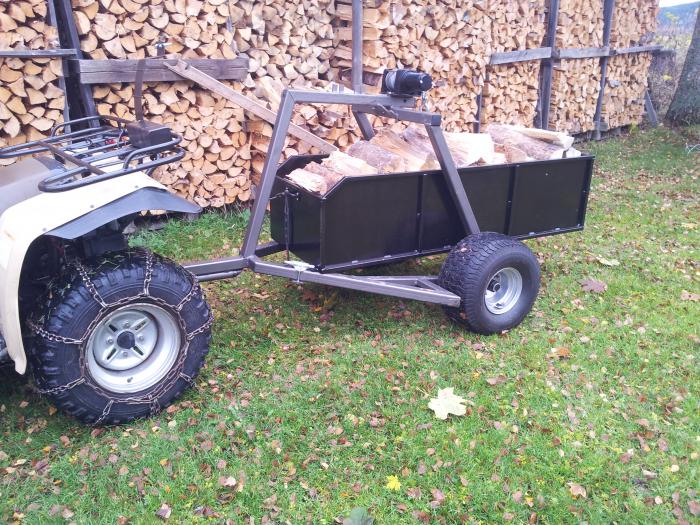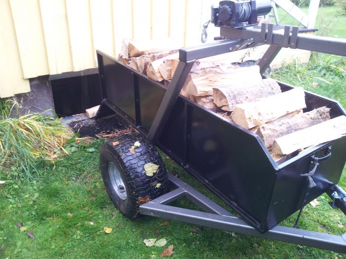 Här kommer några bilder på vedkörning med vagnen. Den rymmer 350liter så det är ju skapligt om man jämför med en skottkärra. Sen är det ju bra mycket roligare att köra med fyrhjulingen:) Veden skjuts lätt ner i "källarfönstret".